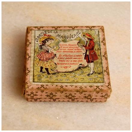 Vers la fin du XIXe siècle, l'effeuillage de la marguerite, cette manière de deviner le degré de force amoureuse de l'élu(e) de son cœur un peu comme l'échelle de Beaufort mesure la force du vent, de "calme" à "tempête" en passant par "petite brise" et "fort coup de vent", ce genre d'oracle a été matérialisé par des fabricants de jeux sous la forme d'une petite boite carrée. L'Oracle de la Marguerite était né !